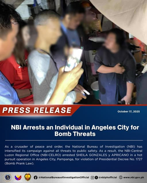 【菲龙网专讯】菲律宾国家调查局(NBI)周五宣布,该局在安吉利斯市逮捕了一名女子,该女子多次对邦板牙省的多所中学和大学发出炸弹威胁。 一段时间以来,邦板牙省安吉利