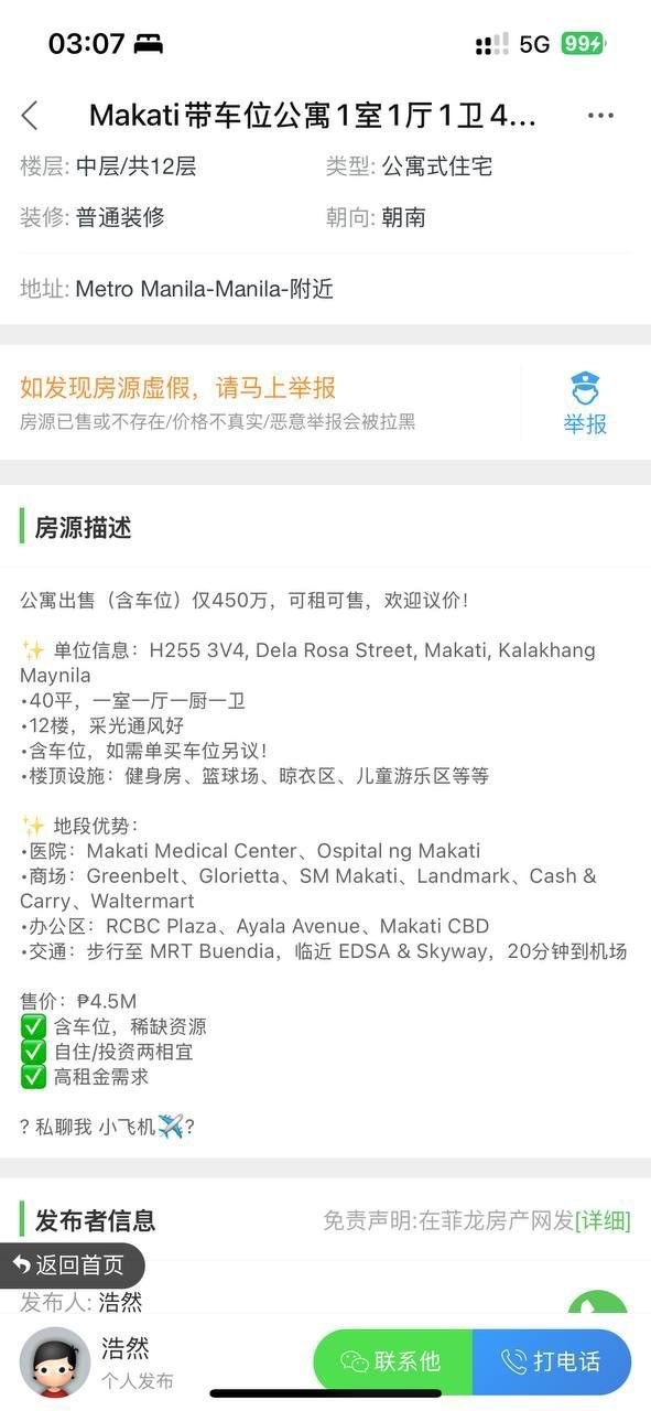 马卡蒂菲华地产9号楼40平方12楼,带车位400万,不带车位350万 租房 一万二一个月,押一付一。至少提前一个月退房。