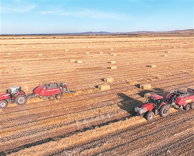 内蒙古自治区呼伦贝尔市的小麦田里,工人在田间对小麦秸秆进行打捆回收作业。王国印摄(人民图片)