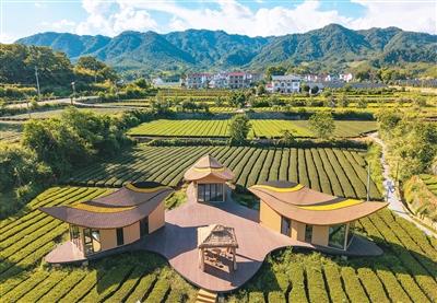 安徽省岳西县琥珀村,民宿与民居、茶园、青山等相映成景,构成一幅和美乡村的生态画卷。王 江摄(人民视觉)