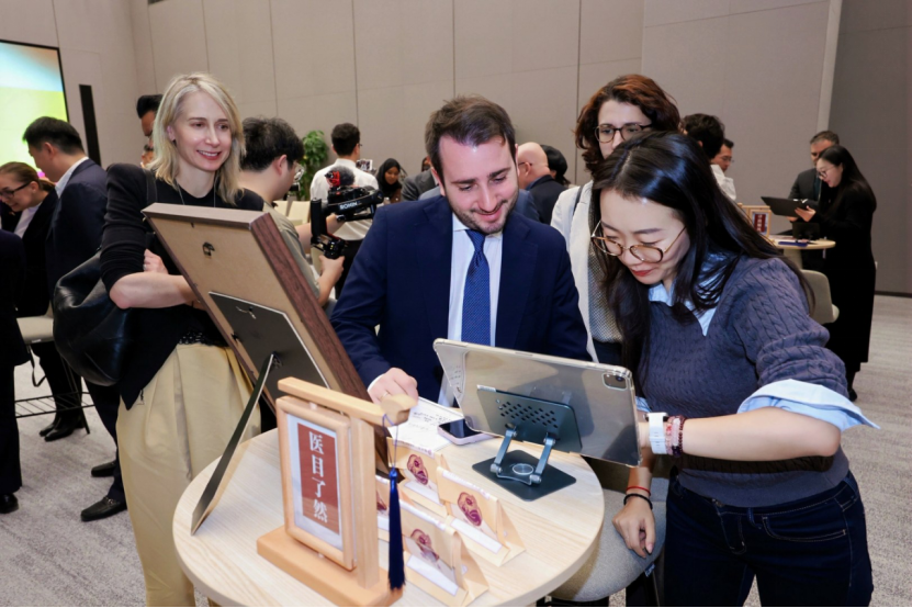 (图说:多位驻华使节在体验区围观“中医天书”)
