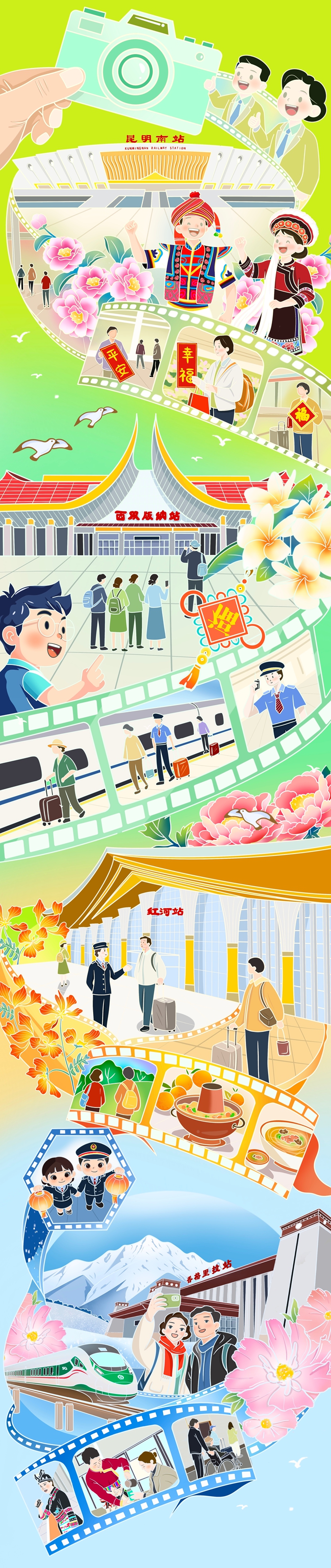 从花香满径的春城到热浪涌动的傣乡,从果香四溢的滇南到雪山环抱的秘境,一趟趟列车穿越寒暑、串联山海,让旅客在旅程中尽览云南四季风光。山海交响间,平安温馨相伴,多语服务、文旅指引、应急护航、温情帮扶……铁路部门用暖心服务守护旅途,让每一段归途都平安顺畅。