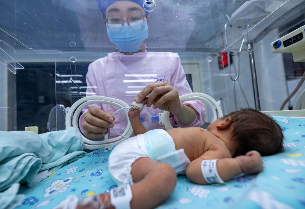 ↑ 2月16日,在南京医科大学附属泰州人民医院新生儿科,护士为新生儿护理。新华社发(汤德宏摄)