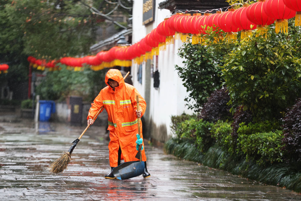 ↑ 2月16日,在浙江省湖州市德清县乾元镇,环卫工人冒雨清扫街道。新华社发(倪立芳摄)