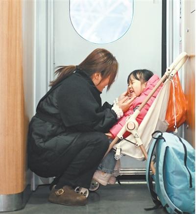江苏省苏州市,昆山南站,列车车厢里,一名旅客与小朋友互动。